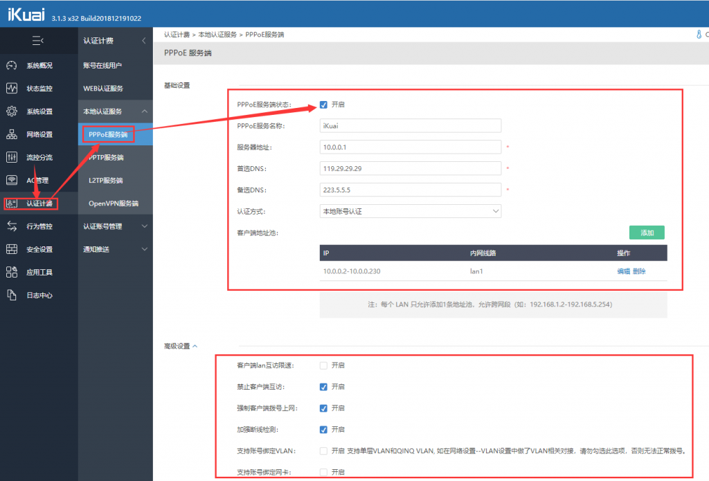 1、PPPoE认证服务的建立:点击“认证计费”——“本地认证服务”——“PPPoE服务”,选中“PPPoE服务端状态”后的“开启”,其它设置保持默认即可(如有需要可以根据实际需求进行修改),最后点击最下方的“保存”。